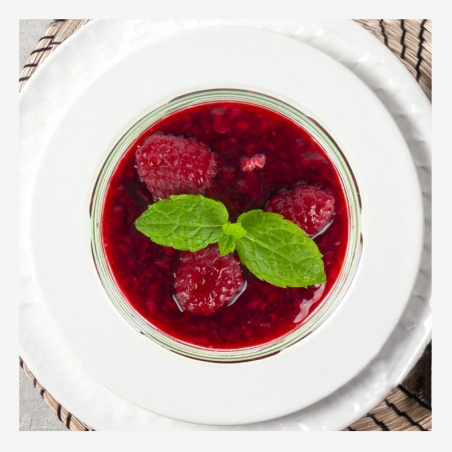 Składniki: Panna cotta (Śmietanka 36% (Z MLEKA), MLEKO SPOŻYWCZE (3.2% tł), Cukier, Woda, Żelatyna, Cukier wanilinowy, Wanilia) (79%), Maliny (Maliny, Woda, Cukier, Żelatyna) (21%)